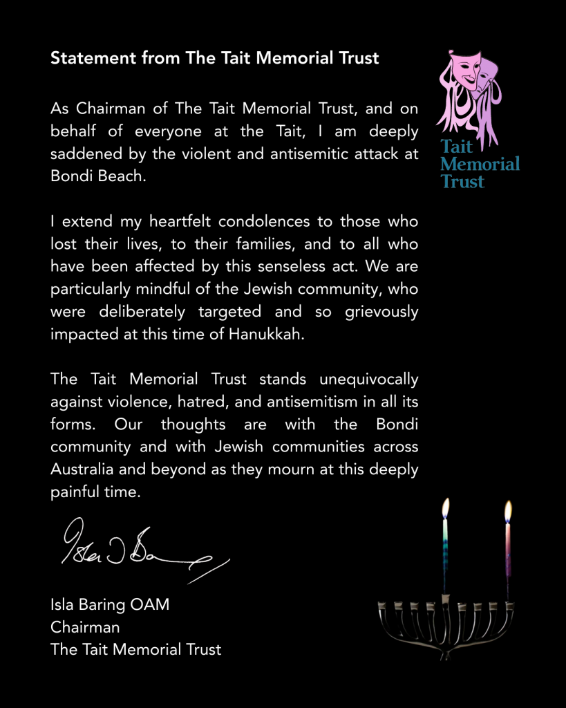 The Tait Memorial Trust was formed in 1992 by Isla Baring OAM in memory of Sir Frank and Viola, Lady Tait and the Tait brothers who played such an important part in the establishment of theatre and the performing arts in Australia & New Zealand. The Trust offers awards/grants for postgraduate study, performance opportunities to young musicians and performing artists from Australia and New Zealand, and general help in the furtherance of their careers while resident in the UK.